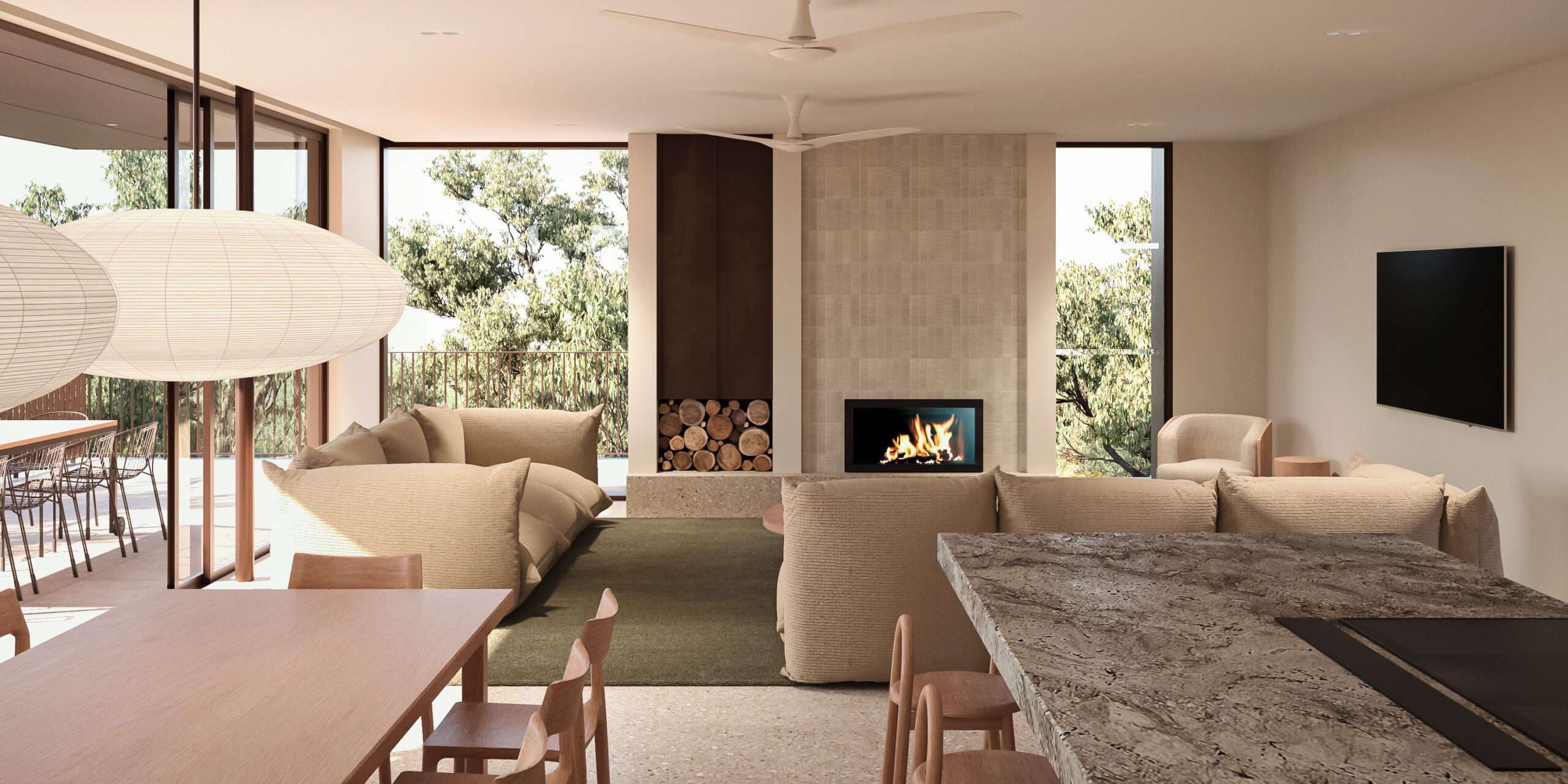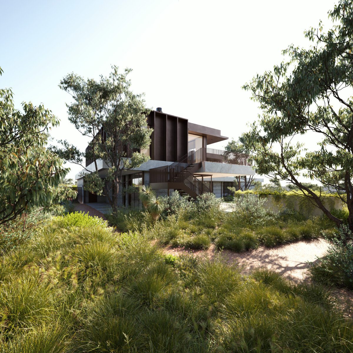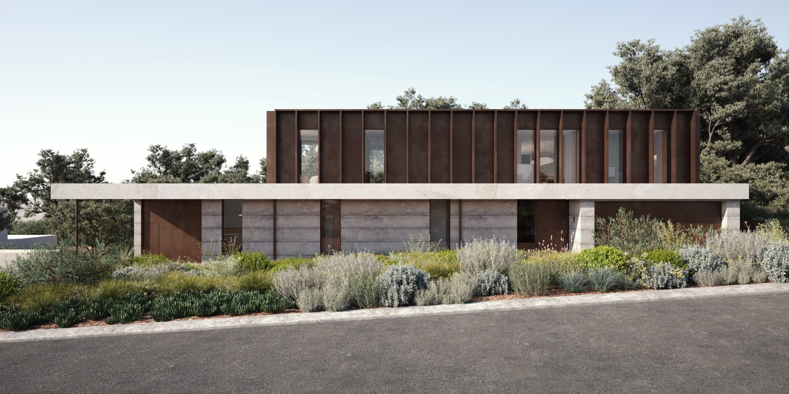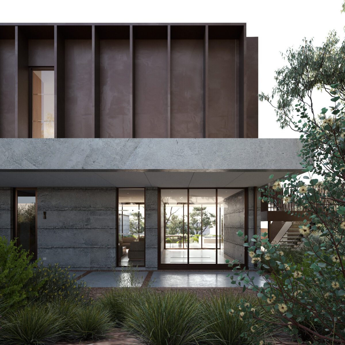 Aligning to the design’s nature-first principles, the proposed residence uses raw, textural material palette that reinforces the connection between indoors and out, while considered spatial planning invites moments of repose and wellness within the broader landscape context.